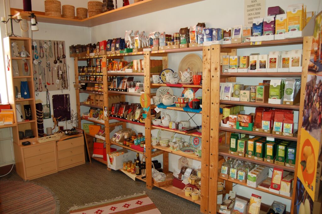 Er befindet sich in der Alten Schule in der Ortsmitte und ist gleichzeitig Anlaufstelle für Gruppen der hiesigen Region, die hier Waren für ihre Aktionen auswählen können, oder für Menschen, die sich für eine gerechte Weltwirtschaft interessieren. Neben einem reichhaltigen Angebot an Kaffee, Tee und Schokolade in vielen Sorten, erlesenen Pralinen, Knabbereien, Honig und Gewürzen, vieles in Bio-Qualität, findet sich eine bunte Vielfalt an Kunsthandwerk und Accessoires, zum Schenken und zum Selberschenken. Auch auf Märkten und Basaren ist der Verein mit einem Verkaufs- und Informationsstand durch ehrenamtlich Mitarbeitende vertreten. Auf unserer Seite Termine finden Sie die aktuellsten Veranstaltungen und unter der Rubrik Aktuelles stellen wir Ihnen Neuigkeiten rund um den Verein und den fairen Handel vor.